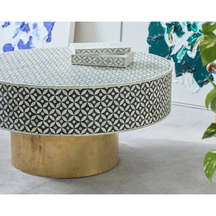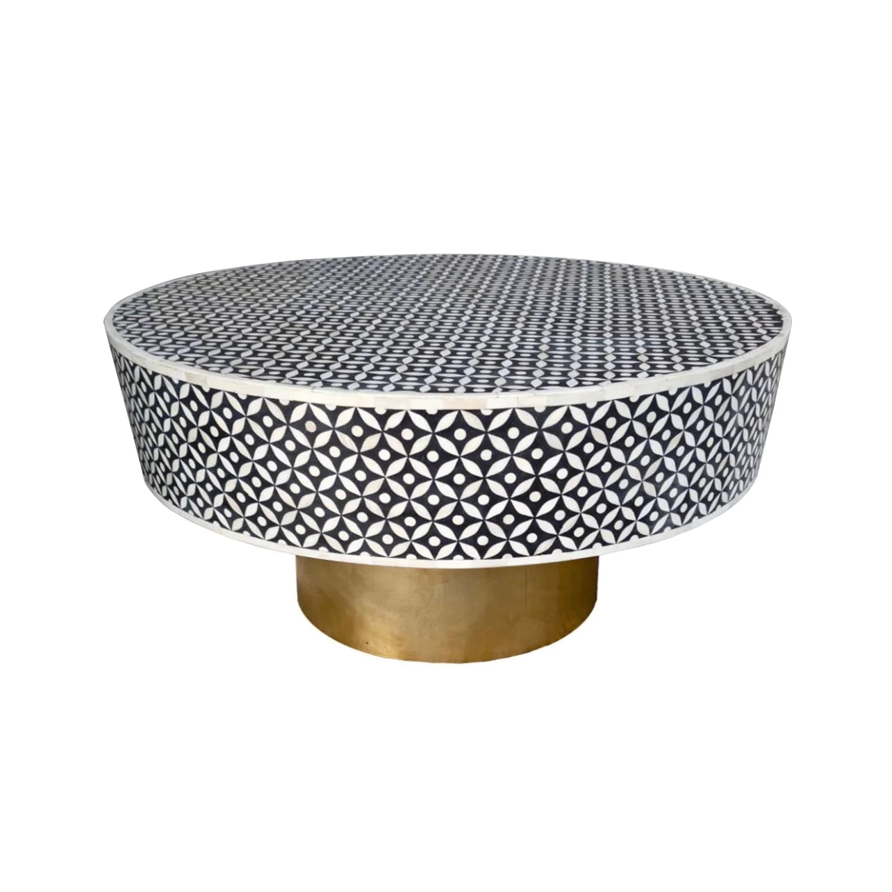 This coffee table is a one-of-a-kind piece that is sure to make a statement in any living room. It features a monochromatic design with intricate hand-carved pieces of buffalo bone inlaid on the surface and filled with resin, all set on a brass base. The table was made by skilled artisans in Rajasthan, India, using traditional techniques passed down for generations. The result is a stunning and durable piece of furniture that will last for years to come.