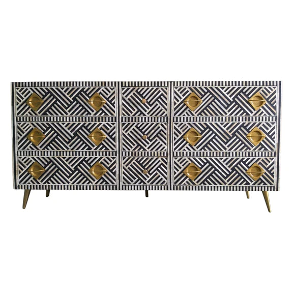 Bone Inlay Criss-Cross Stripe 9-Drawer Sideboard with Brass - Black
