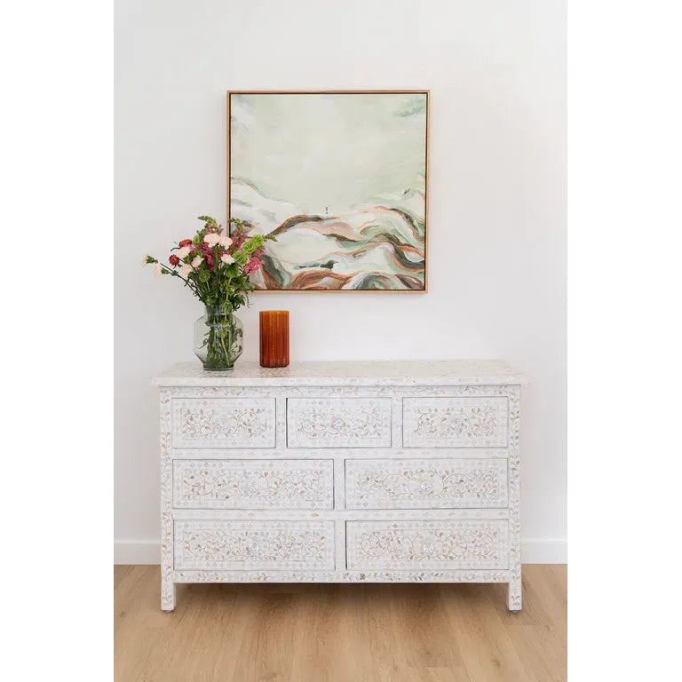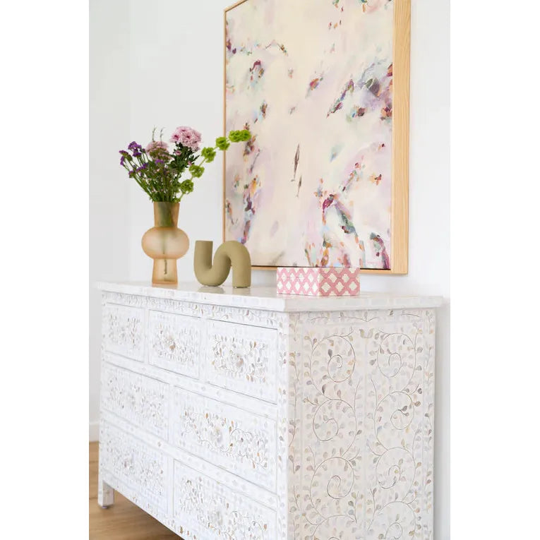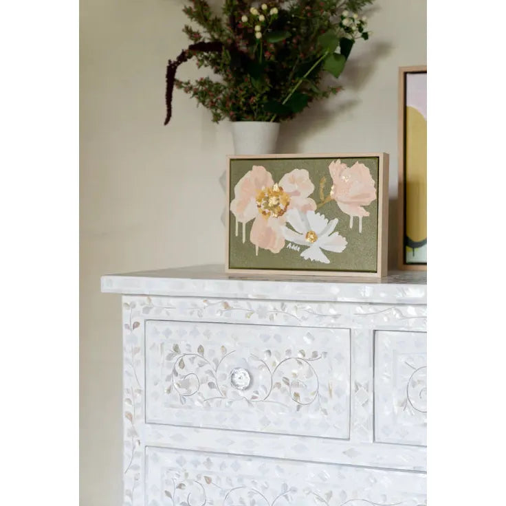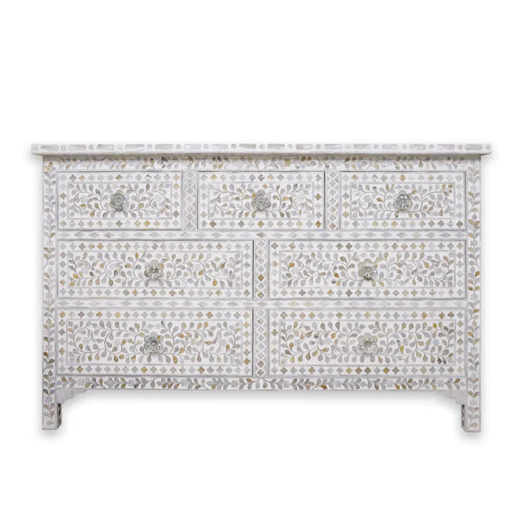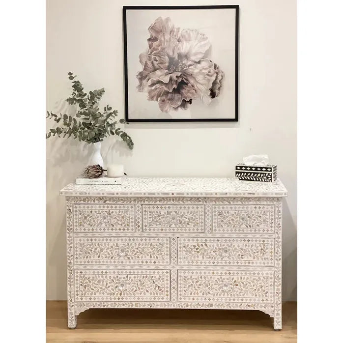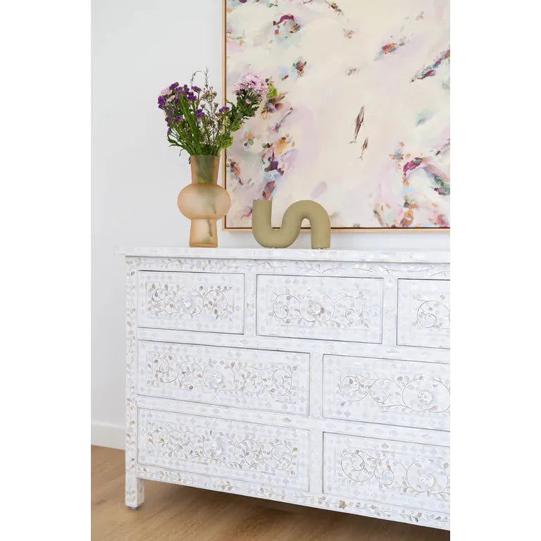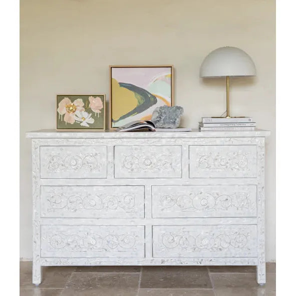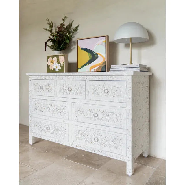 This white floral mother of pearl inlay chest of drawers could be the striking centerpiece for your entrance or living space, or the pièce de résistance in your bedroom or living room or hall.